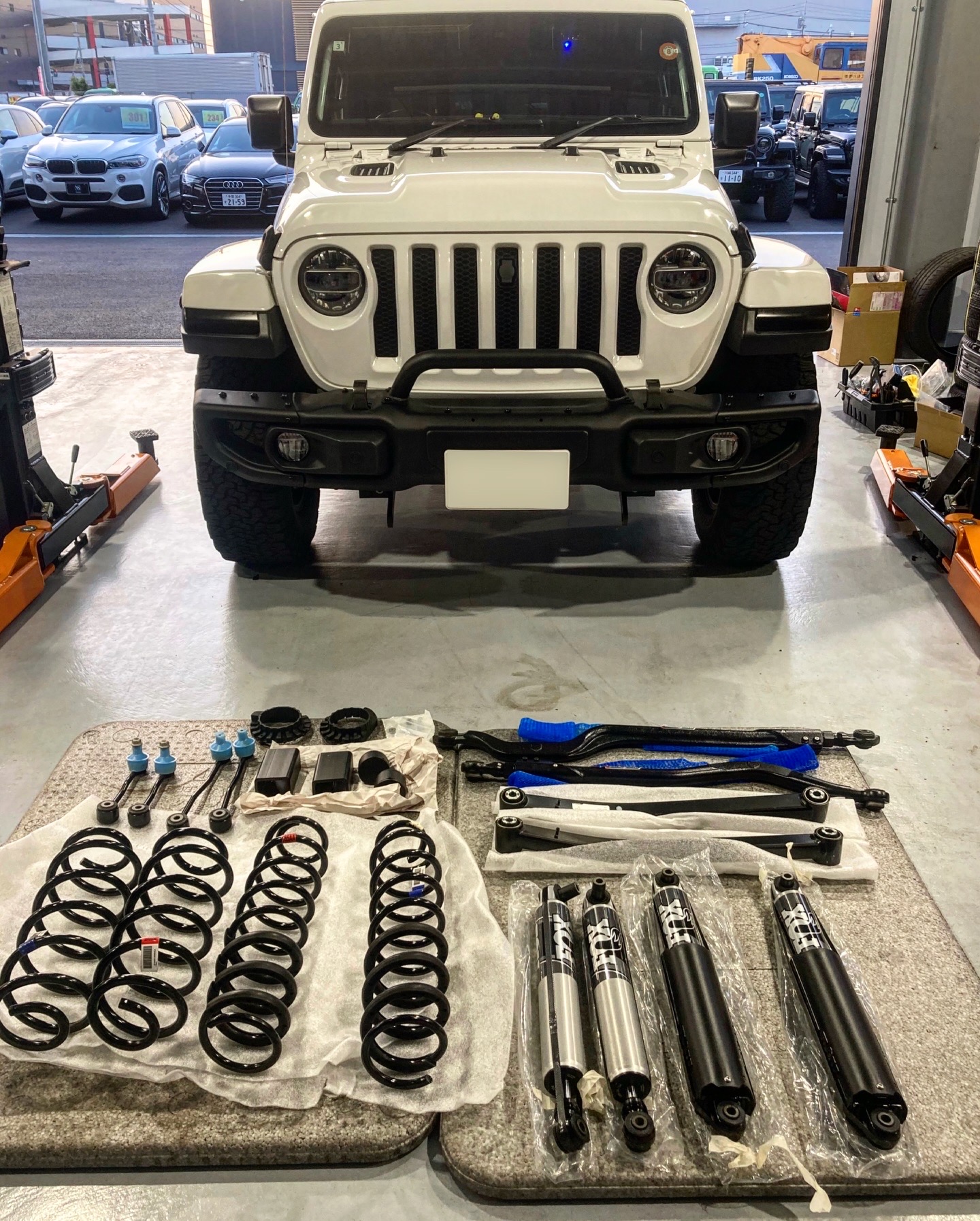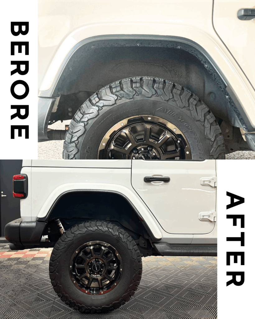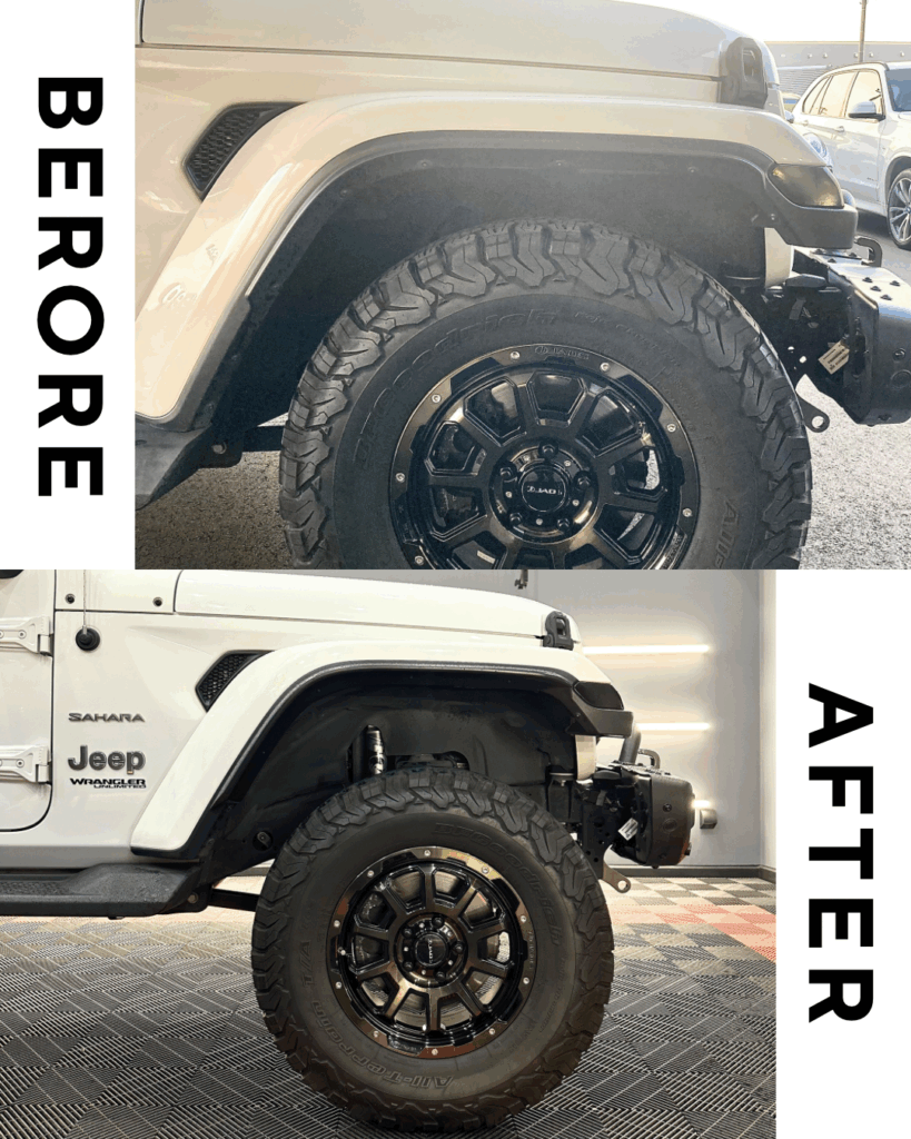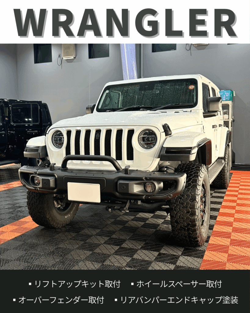 | 作業内容 | リフトアップキット取付/ホイールスペーサー取付/アライメント調整/オーバーフェンダー取付/リアバンパーエンドキャップ塗装 |