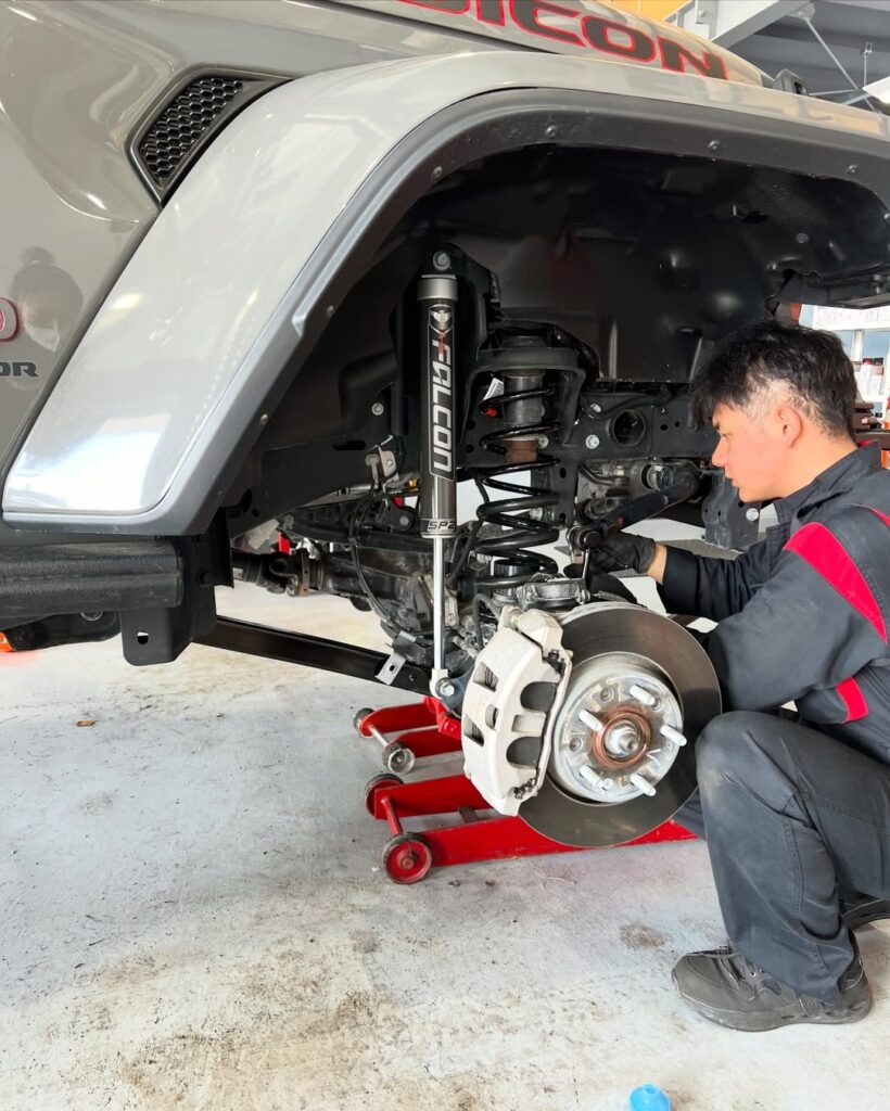 | 作業内容 | リフトアップキット取付/前後ラテラルロッド取付/フロントロアアーム取付/サイドステップ取付/電動ウインチ取付/フェンダーエクステンダー取付/タイヤ交換 |